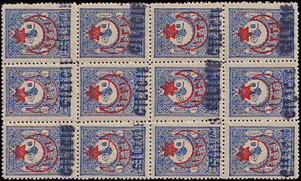 1 Piaster blue block of 12 with partly oily overprint