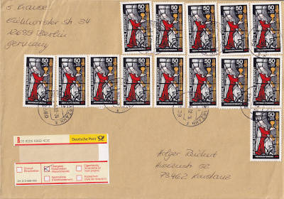 Inlandsbrief mit Wertangabe (150 DM) (16 g) vom 19.07.1981 (8. Periode) frankiert mit 4 Briefmarken a 90 Pfennig (=3,60 Mark, 0,60 Brief 3 Wert) |