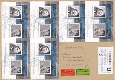 Inlandsblindensendung mit Übergabe-Einschreiben, Rückschein und eigenhändiger Zustellung vom 08.06.2021 (10. Periode) frankiert mit 6 Blocks a 1,15 € (=6,90 €, 0 Blindensendung 2,50 Übergabe-Einschrei- ben 2,20 Rückschein 2,20 Eigenhändig) |