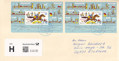 Inlandsbüchersendung (501-1 000 g) vom 20.07.2021 (10. Periode) frankiert mit 2 Blocks a 1,10 € (=2,20 €) |