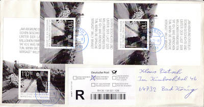 Inlandsbrief mit Übergabe-Einschreiben (1-20 g) vom 08.06.2021 (10. Periode) frankiert mit 3 Blocks a 1,10 € (=3,30 €, 0,80 Brief 2,50 Übergabe-Einschreiben) |