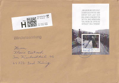 Inlandsblindensendung mit prioritärer Behandlung vom 17.03.2022 (11. Periode) frankiert mit einem Block a 1,10 € (=1,10 €, 0 Blindensendung 1,10 Prio |