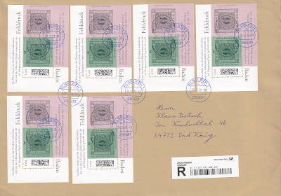 Inlandsbrief mit Einwurf-Einschreiben (501-1 000 g) vom 28.03.2023 (11. Periode) frankiert mit 6 Blocks a 0,85 € (=5,10 €, 2,75 Brief 2,35 Einwurf-Einschreiben) |