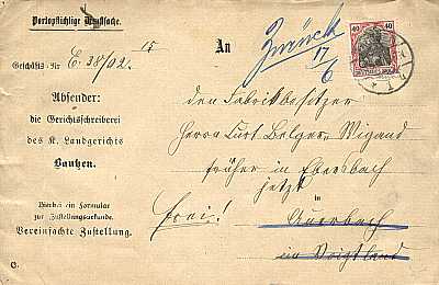 Inlandsbrief mit Zustellungsurkunde (1-20 g) vom 16.06.1902 frankiert mit einer Marke a 40 Pfennig (=40 Pfennig, 10 Brief 20 Zustellung 10 Urkunde) |