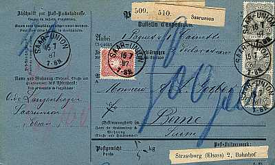Auslandspaketkarte (2x 5 000 g) vom 15.07.1887 frankiert mit 4 Marken