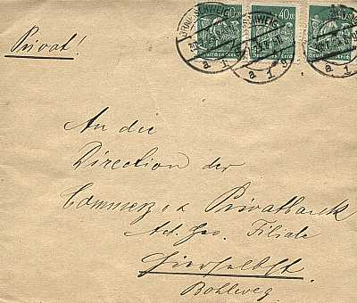 Local cover (1-20 g) from 30.07.1923 (14. Period) franked with 3 stamps a 40 Mark (=120 Mark) |