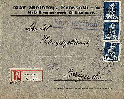 Inlandsbrief mit Einschreiben (1-20 g) vom 02.11.1920 (5. Periode) frankiert mit 3 Marken a 30 Pfennig (=90 Pfennig, 40 Brief 50 Einschreiben)