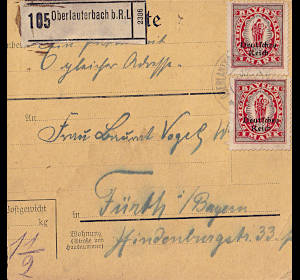 Inland parcel card (1 500 g, > 75 km) from 19.05.1920 (5. Period) franked with 2 stamps a 1 Mark (=2 Mark)