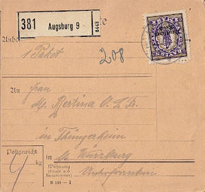 Inland parcel card (4 000 g, > 75 km) from 27.12.1920 (5. Period) franked with one stamp a 2 Mark (=2 Mark) |