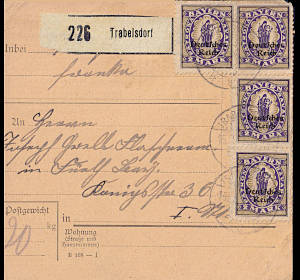 Inland parcel card (20 000 g, > 75 km) from 15.09.1920 (5. Period) franked with 4 stamps a 2 Mark (=8 Mark) |