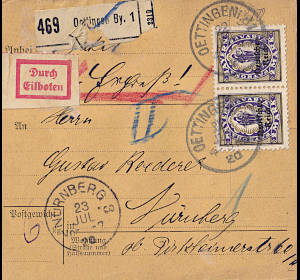 Inland parcel card with special delivery (6 000 g, < 75 km) from 22.07.1920 (5. Period) franked with 2 stamps a 2 Mark (=4 Mark, 2,50 parcel 1,50 special delivery) |