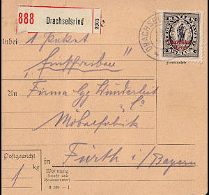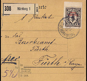 Inland parcel card (5 500 g, < 75 km) from 15.09.1920 (5. Period) franked with one stamp a 2½ Mark (=2,50 Mark) |