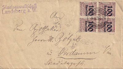 Inlandsbrief (1-20 g) vom 16.10.1923 (20. Periode) frankiert mit 50 Marken a 100 000 Mark auf 15 Pfennig (=5 Millionen Mark)