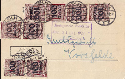 Inlandspostkarte vom 09.10.1923 (19. Periode) frankiert mit 8 Marken a 100 000 Mark auf 15 Pfennig (=800 000 Mark)