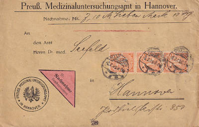 Local cover with cash on delivery (1-20 g) from 03.07.1920 (5. Period) franked with 3 stamps a 30 Pfennig (=90 Pfennig, 40 cover 50 cash on delivery)