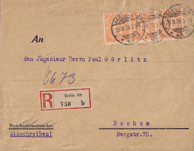 Inland cover with registeration (1-20 g) from 28.09.1920 (5. Period) franked with 3 stamps a 30 Pfennig (=90 Pfennig, 40 cover50 registeration)