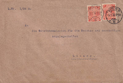 Inlandsbrief (1-20 g) vom 05.01.1922 (7. Periode) frankiert mit 2 Marken a 1 Mark