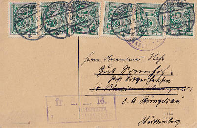 Inlandspostkarte vom 09.08.1920 (5. Periode) frankiert mit 6 Marken a 5 Pfennig