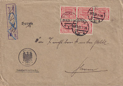 Ortsbrief (21-100 g) vom 29.08.1922 (8. Periode) frankiert mit 5 Marken a 40 Pfennig (=2 Mark) |