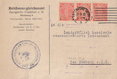 Inland cover (1-20 g) from 31.08.1922 (8. Period) franked with 3 stamps a 1 Mark (=3 Mark) |