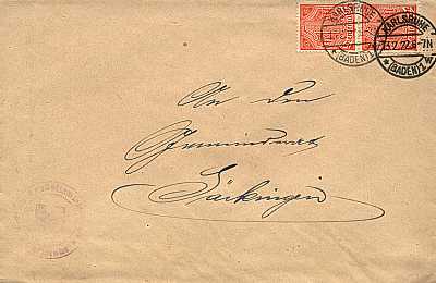 Inland cover (1-20 g) from 13.02.1922 (7. Period) franked with 2 stamps a 1 Mark (=2 Mark) |