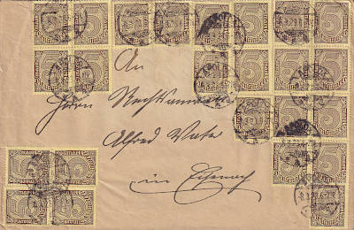 Inlandsbrief (21-100 g) vom 08.03.1923 (13. Periode) frankiert mit 24 Marken a 5 Mark (=120 Mark) |