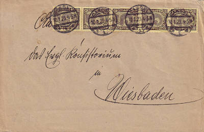 Inlandsbrief (1-20 g) vom 10.01.1923 (11. Periode) frankiert mit 5 Marken a 5 Mark (=25 Mark) |