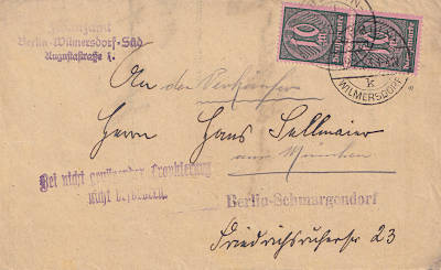 Local cover (1-20 g) from 12.02.1923 (12. Period) franked with 2 stamps a 10 Mark (=20 Mark) |