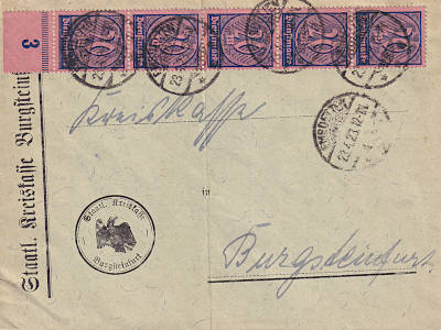Inlandsbrief (1-20 g) vom 23.04.1923 (13. Periode) frankiert mit 5 Marken a 20 Mark (=100 Mark) |