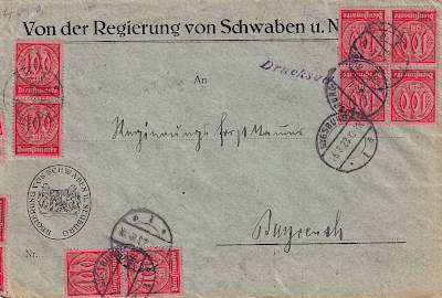 Inlandsbrief mit Einschreiben (1-20 g) vom 09.07.1923 (14. Periode) frankiert mit 6 Marken a 100 Mark (=600 Mark, 300 Brief 300 Einschreiben) |