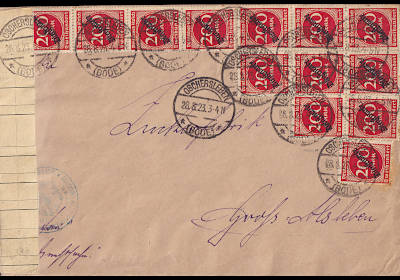 Inland cover (1-20 g) from 28.08.1923 (16. Period) franked with 100 stamps a 200 Mark