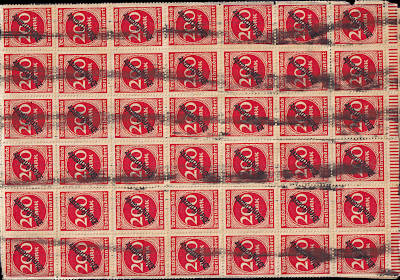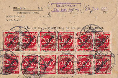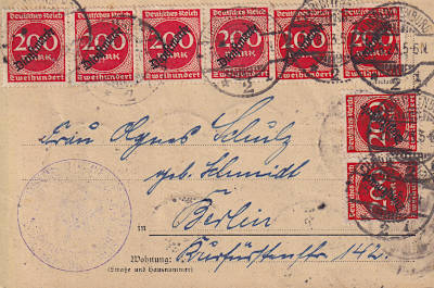 Local postcard from 25.08.1923 (16. Period) franked with 20 stamps a 200 Mark