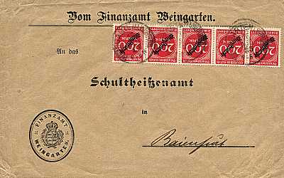 Inland cover (1-20 g) from 16.08.1923 (15. Period) franked with 5 stamps a 200 Mark