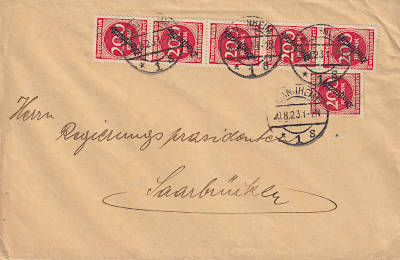 Inland cover (21-100 g) from 20.08.1923 (15. Period) franked with 6 stamps a 200 Mark