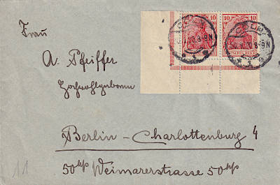 Inlandsbrief (21-250 g) vom 10.10.1910 (1. Periode) frankiert mit 2 Marken a 10 Pfennig (=20 Pfennig) |