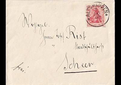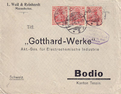 Auslandsbrief im Grenzverkehr (1-20 g) vom 20.10.1915 (1. Periode) frankiert mit einer Marke a 10 Pfennig (=10 Pfennig); in die Schweiz galt bis 30 km der Inlandstarif |