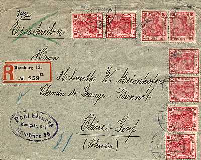 Auslandsbrief mit Einschreiben (21-40 g) vom 17.01.1920 (4. Periode) frankiert mit 8 Marken a 10 Pfennig (=80 Pfennig, 50 Brief 30 Einschreiben) |