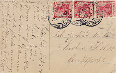 Inlandspostkarte vom 25.05.1920 (5. Periode) frankiert mit 3 Marken a 10 Pfennig (=30 Pfennig) |