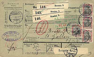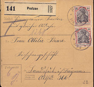 Inland parcel card (6 000 g, 375-750 km) from 13.01.1916 (1. Period) franked with 2 stamps a 40 Pfennig (=80 Pfennig) |