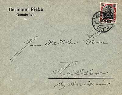 Foreign cover (1-20 g) from 20.08.1920 (5. Period) franked with 2 stamps a 40 Pfennig (=80 Pfennig) |