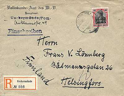 Foreign cover with registeration (1-20 g) from 27.12.1918 (3. Period) franked with one stamp a 40 Pfennig (=40 Pfennig, 20 cover 20 registeration) |