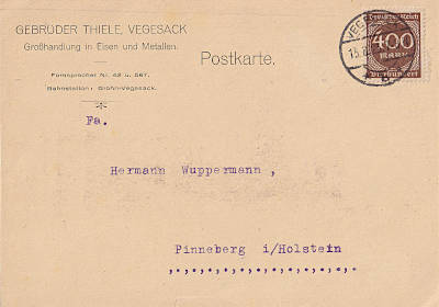 Inland postcard from 13.08.1923 (15. Period) franked with one stamp a 400 Mark(=400 Mark)