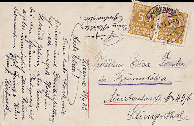 Inlandspostkarte vom 26.09.1923 (18. Periode) frankiert mit 2 Marken a 50 000 Mark (=100 000 Mark) |