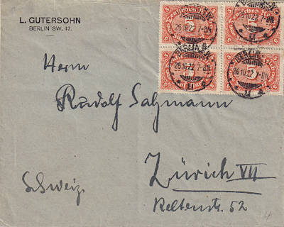 Foreign cover (1-20 g) from 26.10.1922 (9. Period) franked with 4 stamps a 5 Mark (=20 Mark) |