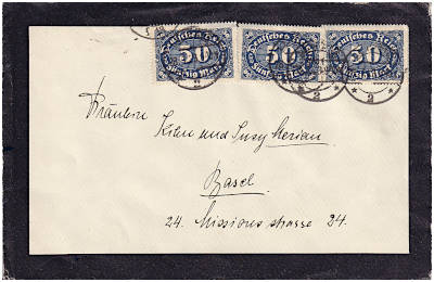 Foreign cover (1-20 g) from 28.01.1923 (12. Period) franked with 3 stamps a 50 Mark (=150 Mark) |