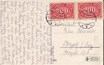 Inland postcard from 20.08.1923 (15. Period) franked with 2 stamps a 200 Mark