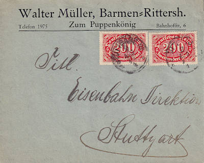 Local cover (1-20 g) from 02.08.1923 (15. Period) franked with 2 stamps a 200 Mark (=400 Mark)