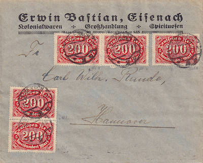 Inland cover (1-20 g) from 13.08.1923 (15. Period) franked with 5 stamps a 200 Mark