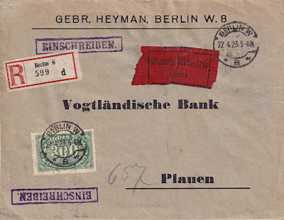 Inlandsbrief mit Einschreiben und Eilzustel- lung (1-20 g) vom 27.04.1923 (13. Periode) frankiert mit einer Marke a 300 Mark (=300 Mark, 100 Brief 80 Einschreiben 120 Eilzustellung) |