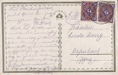 Inland postcard from 23.06.1923 (13. Period) franked with 2 stamps a 20 Mark (=40 Mark) |